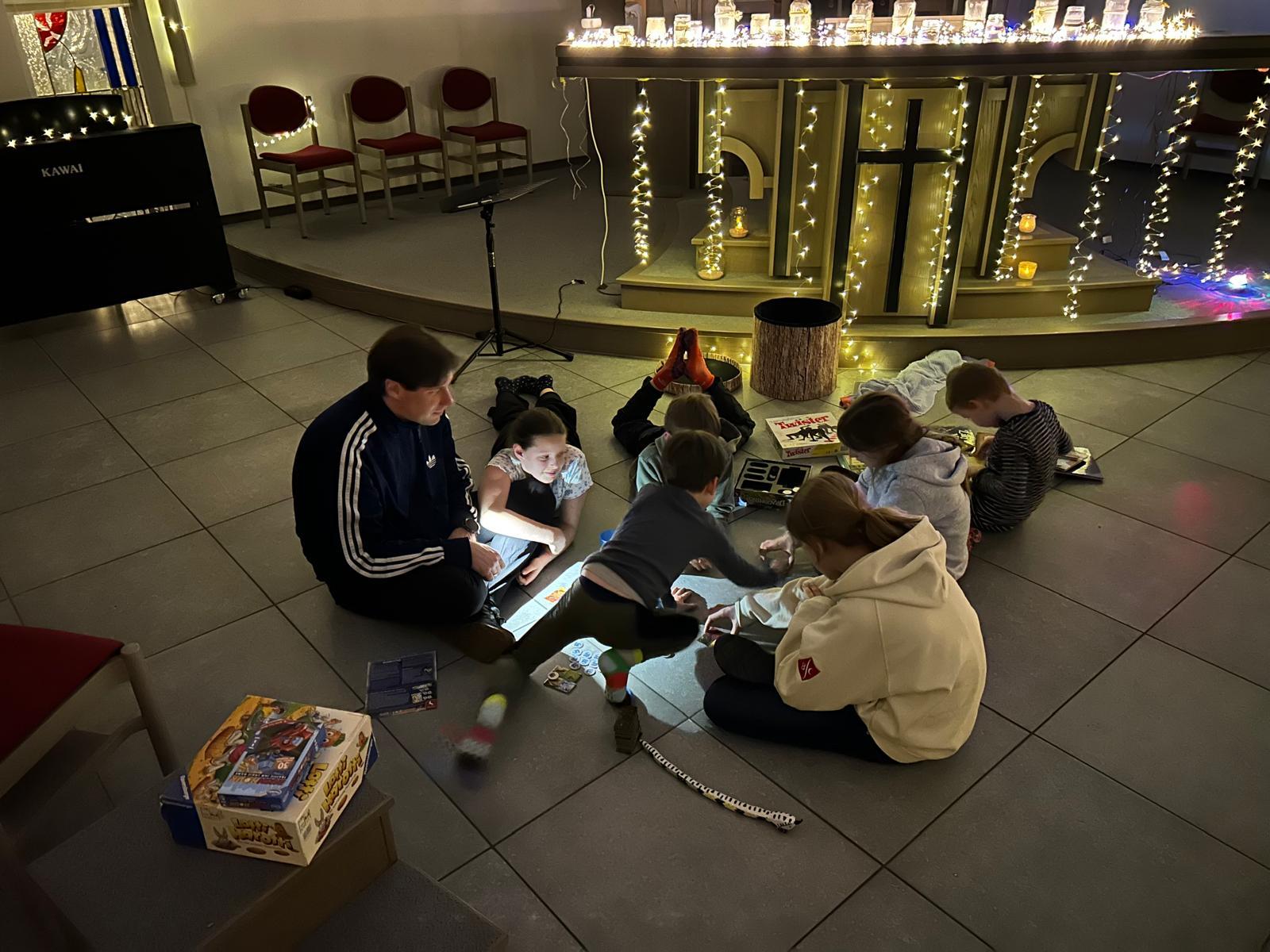 Mit einem Monat Verspätung (auf Grund von zu vielen Krankmeldungen) konnte nun endlich wieder eine Übernachtung in unserer Kirche stattfinden. Fleißige Hände hatten diese mit viel Liebe und Lichterketten dekoriert, Raum für Schlafplätze vorbereitet und für eine gute Stimmung beim Eintreffen der Kinder gesorgt.