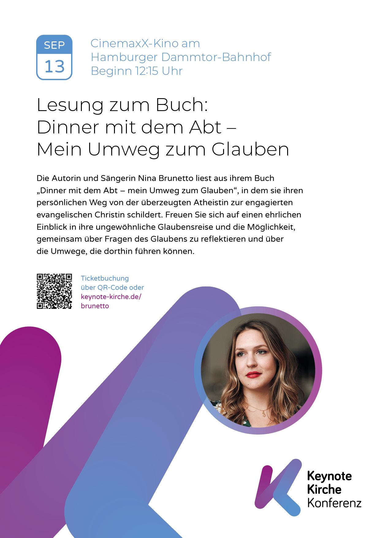 Die Autorin und Sängerin Nina Brunetto lädt Sie herzlich zu ihrer Lesung ein. Sie wird aus ihrem Buch Dinner mit dem Abt – mein Umweg zum Glauben (Vier-Türme-Verlag) lesen, in dem sie ihren persönlichen Weg von der überzeugten Atheistin zur engagierten Christin schildert.
