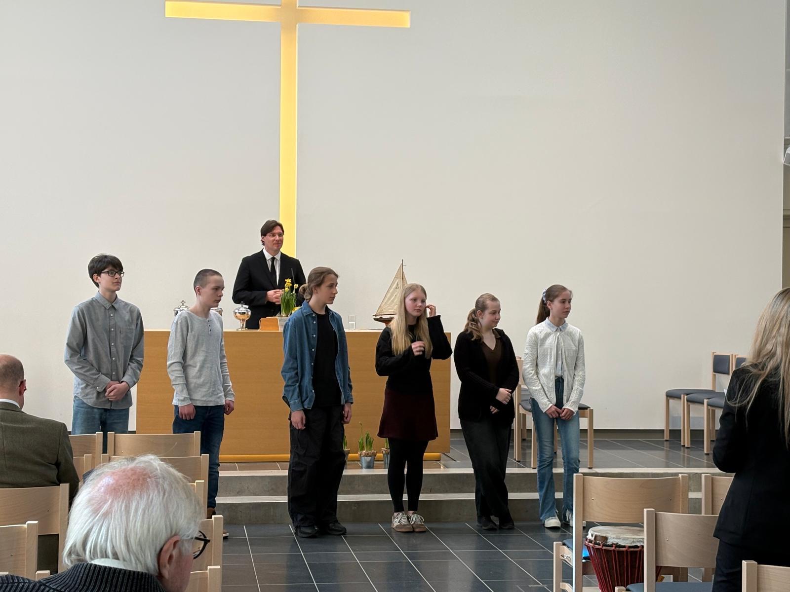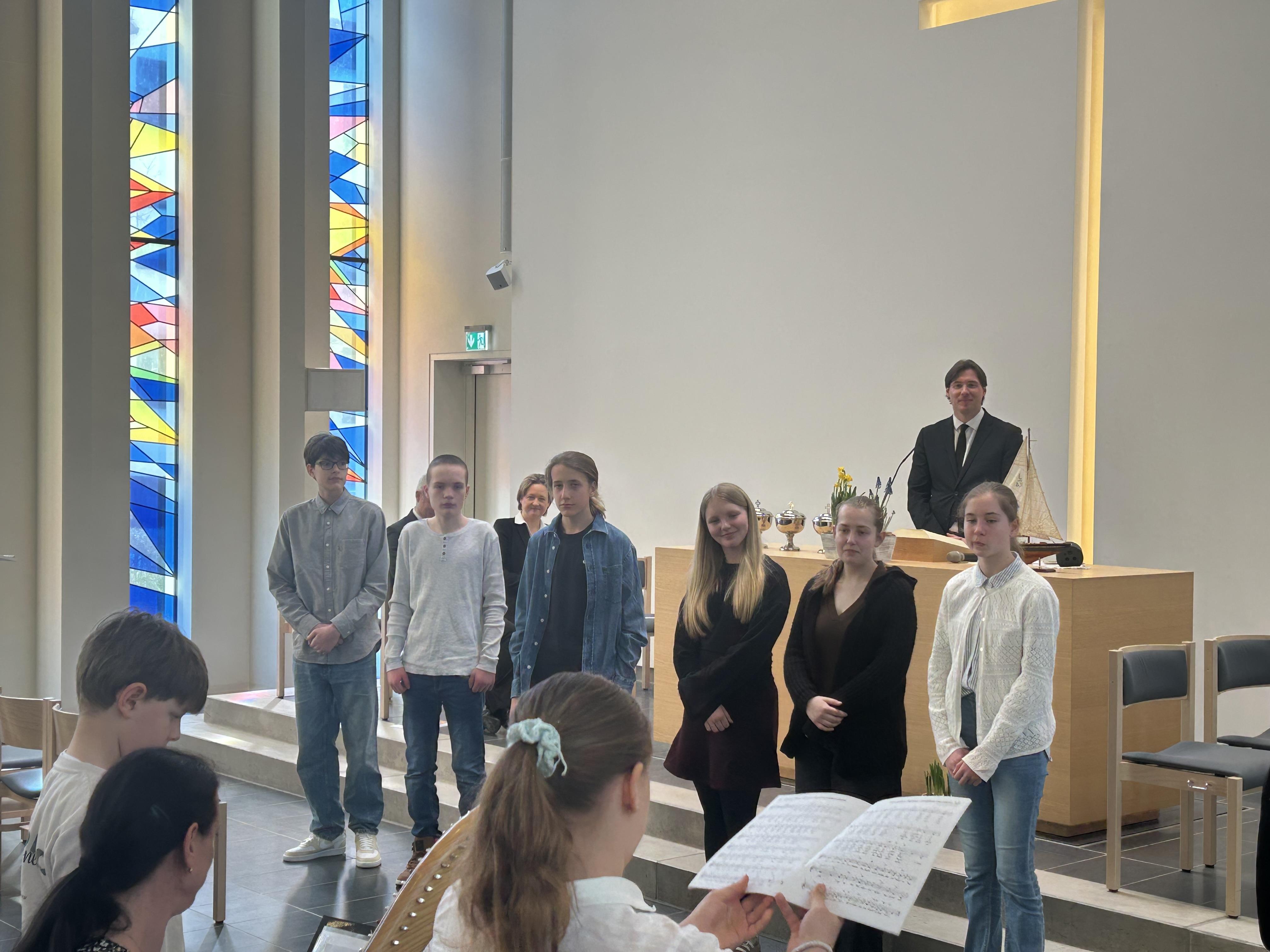 In diesem Gottesdienst wurden auch unsere diesjährigen Konfirmanden aus dem Kreis der Kinder verabschiedet. Ihnen gab Priester Lang sowie Diakonin Weber, welche den Co-Predigtbeitrag hielt, mit auf den Weg, dass es mit Gott im Boot nur gut werden kann. Wenn sie jetzt in den Kreis der Jugend segeln brauchen sie keine Angst haben, denn nicht nur Gott, sondern auch die anderen Jugendlichen sind da, die sie gern ins „Schlepptau“ nehmen. Zum Ende des Gottesdienstes wurde die Konfirmanden mit einem Liedbeitrag und einem schönen Geschenk verabschiedet. Ihnen viel Freude im Kreis der Jugend!