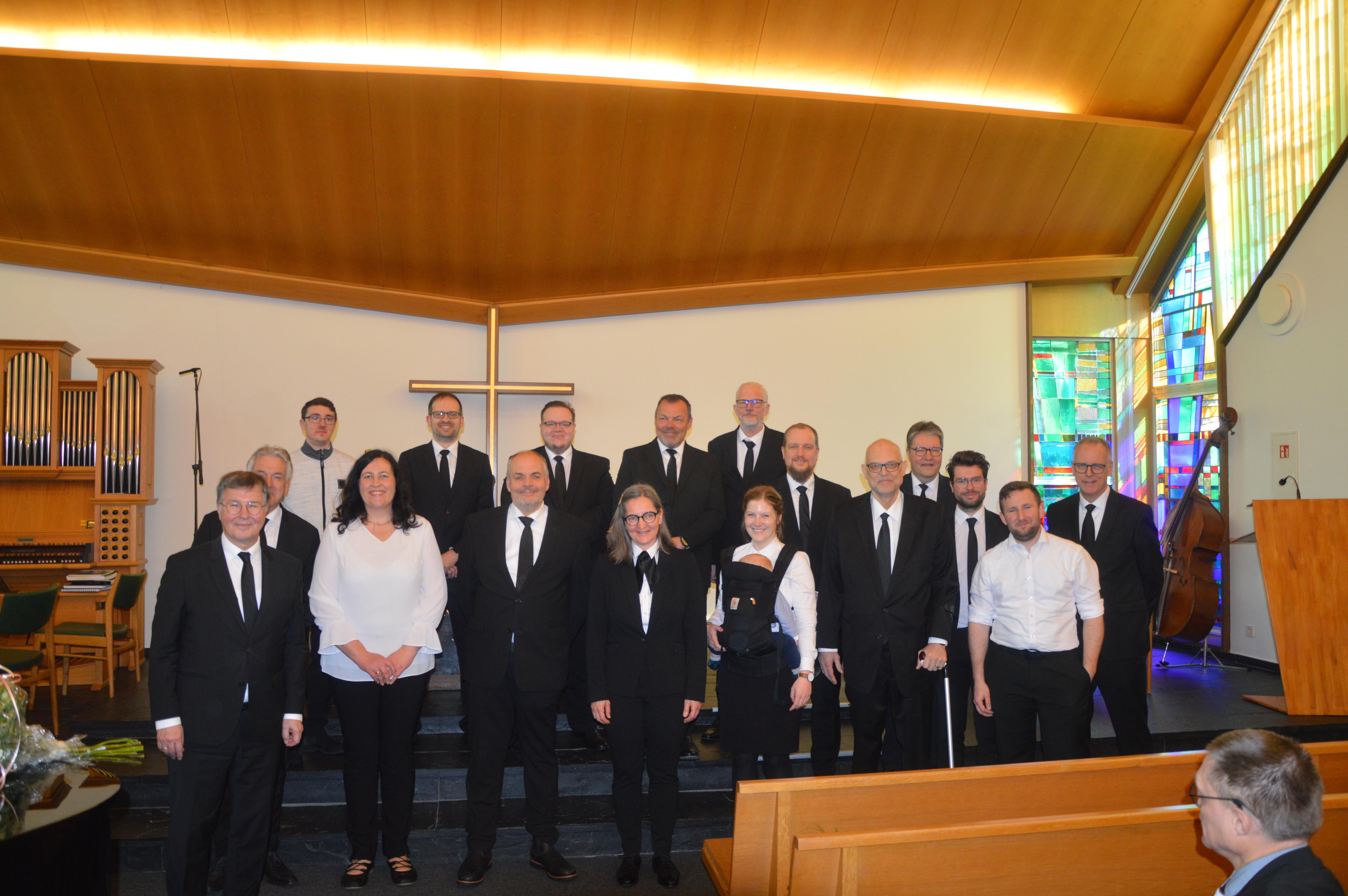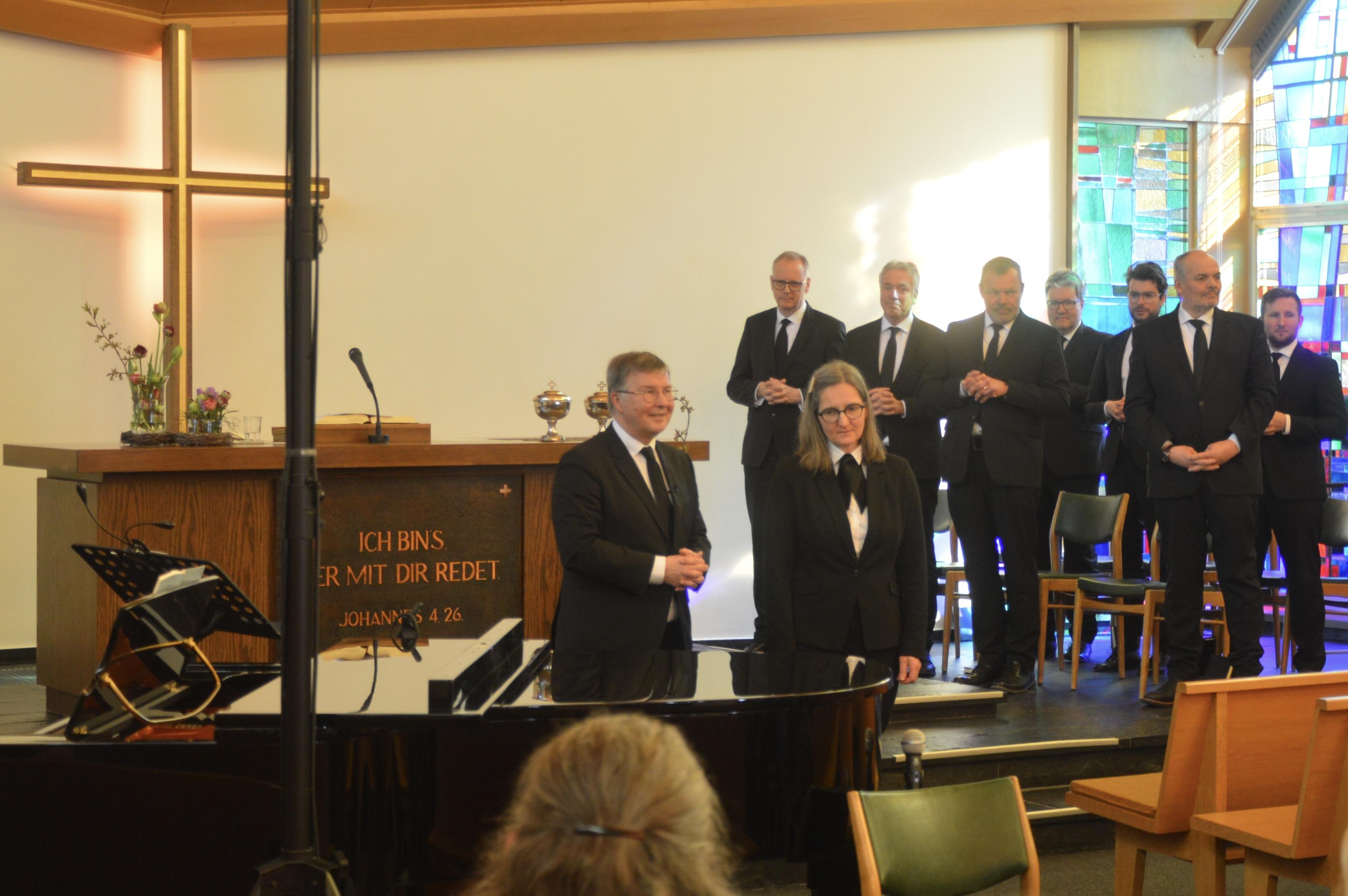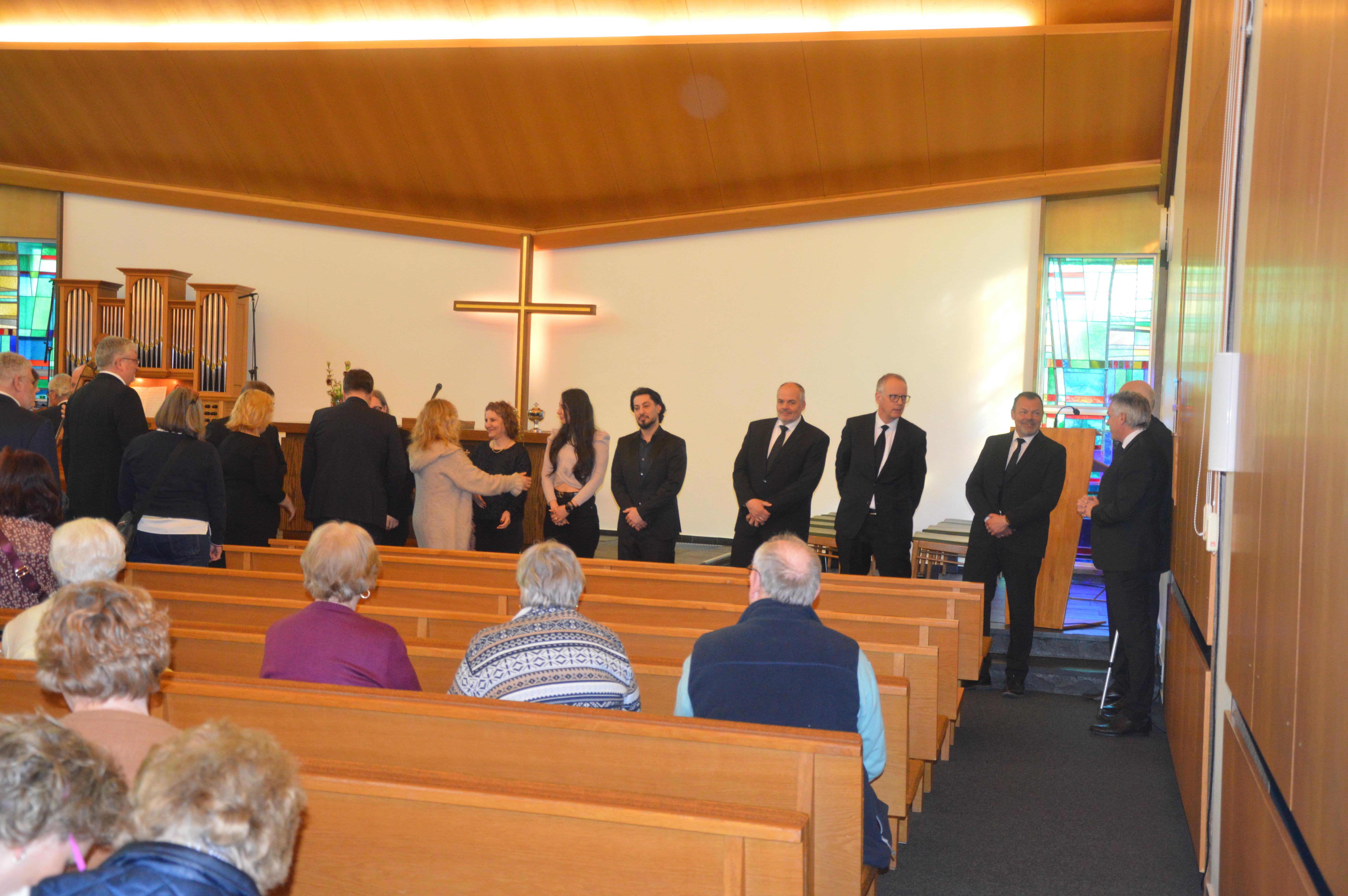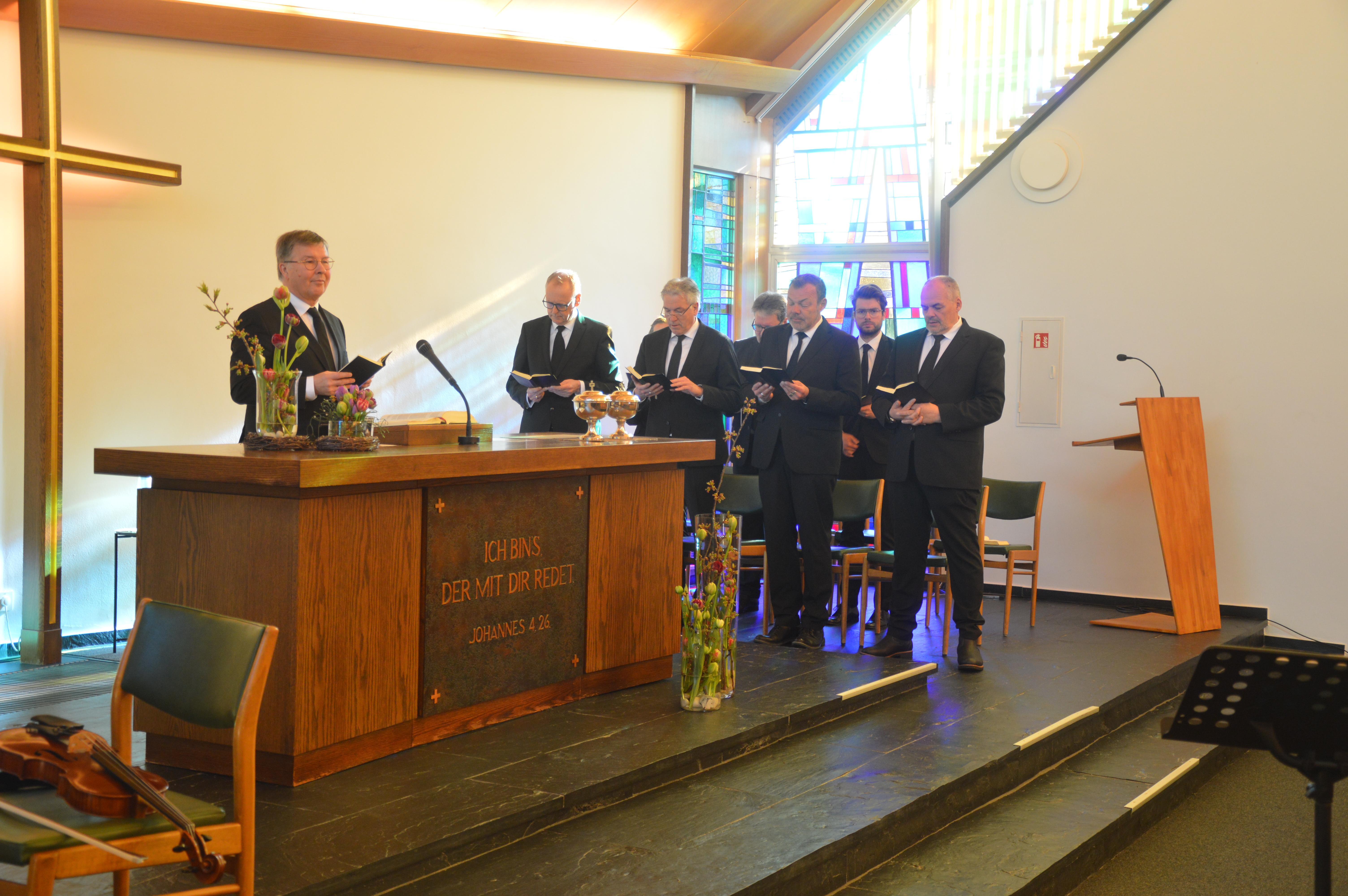 Nach dem Unser Vater und der Sündenvergebung war der Zeitpunkt der Versieglung von Mahnaz, Sahar und Elia gekommen. Der Apostel spürte, wieviel Gutes und Liebenswürdiges von den Dreien ausging und freute sich mit der Gemeinde über den Zuwachs durch solche tollen Menschen. Nach der Feier des Heiligen Abendmahls stand die Ruhesetzung von Priester Volker Deterding und Diakon Stefan Meyer an, die 1987 auch gemeinsam in das Unterdiakonen-Amt gesetzt wurden. Beiden wurde vom Apostel für ihre unterschiedliche Arbeit gedankt, die sie jahrzehntelang geleistet haben.