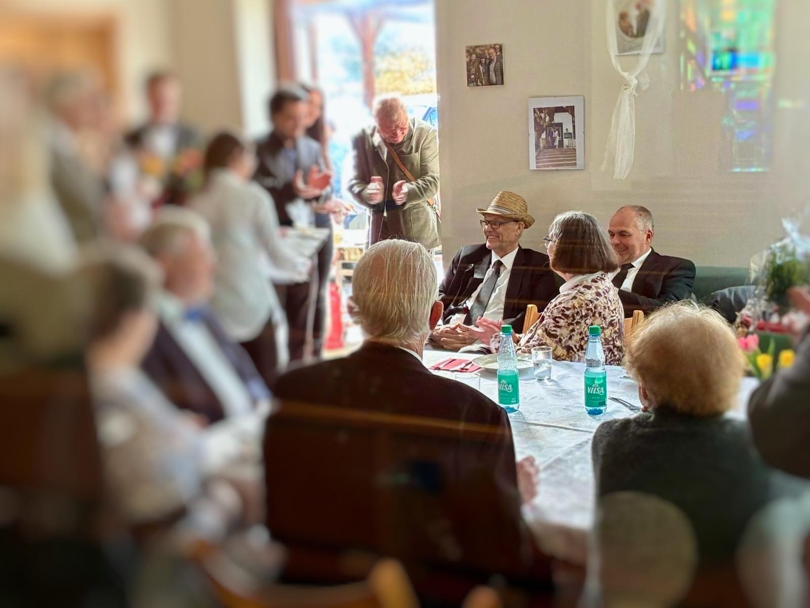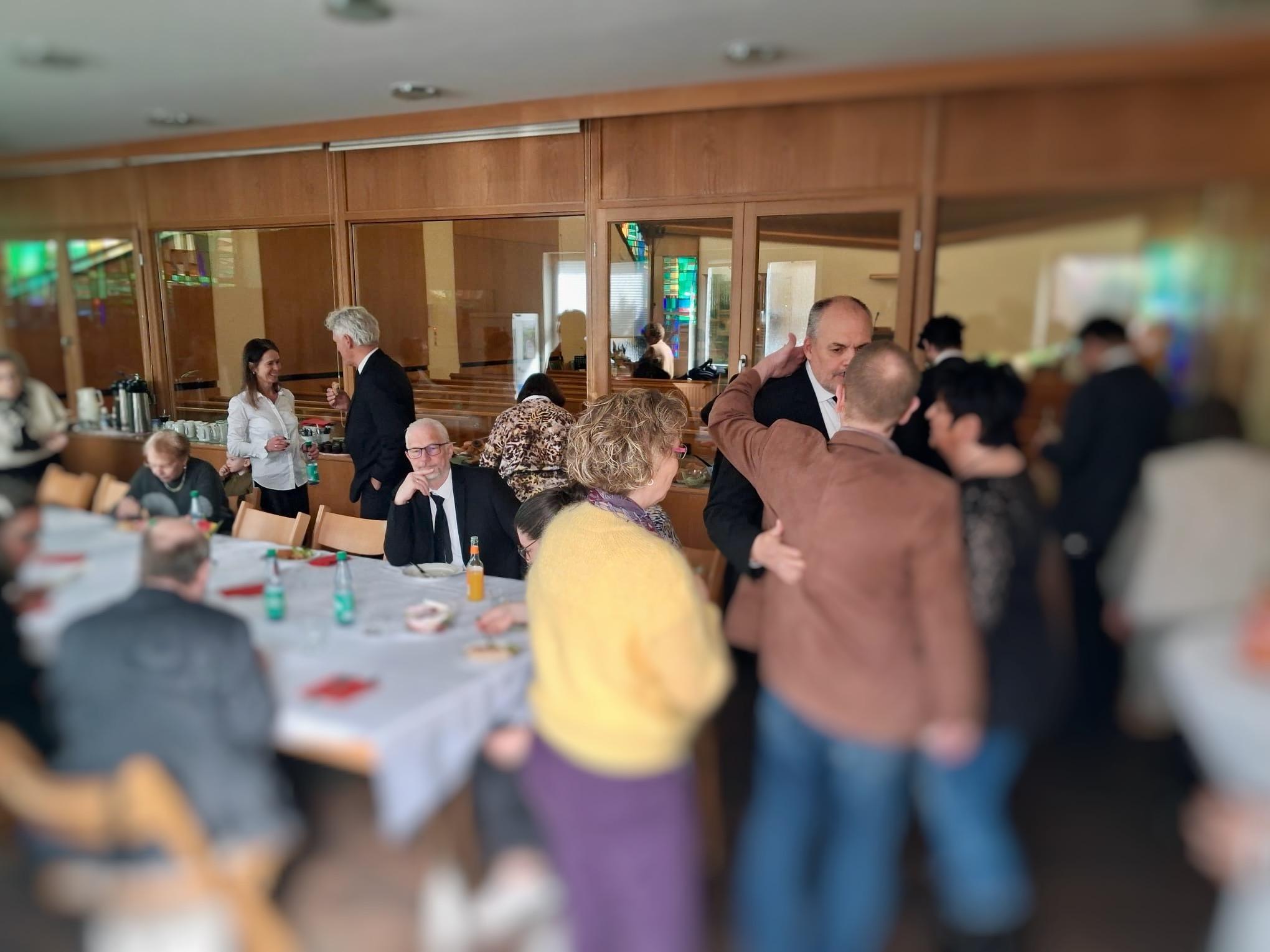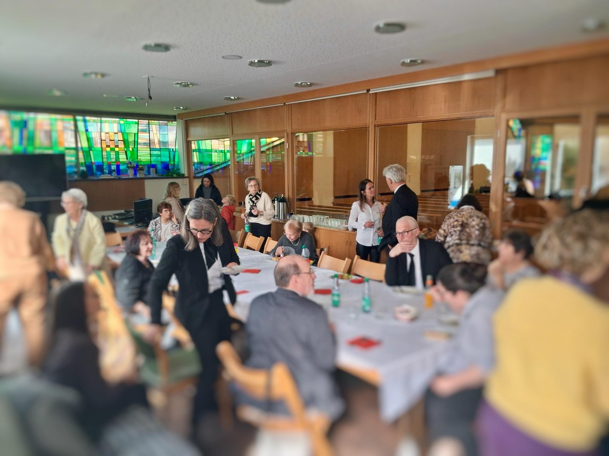 Das Ende des Gottesdienstes war für die meisten Anwesenden noch kein Grund, den Heimweg anzutreten, denn natürlich war für alle von fleißigen Händen noch Speis und Trank vorbereitet worden. Im Gemeinschaftsraum der Kirche fand dann auch die Übergabe der Geschenke und Blumen an die frischgebackenen Ruheständler statt, die beide persönlich verfasste Zeilen vorgetragen und überreicht bekamen.